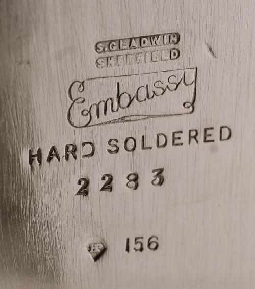 A Stylish Silver Plated Art Deco Champagne Bucket of heavy construction (Hotel Quality ) with reeded design to main body and carrying handles to each side. Made by S Gladwin Sheffield England. ( 1921 - 1936 ) FREE worldwide & UK delivery. Measurements: Height: to handle 9 (approx 23cm) Diameter across top: 6 3/4 (approx 17cm) Diameter across base: 5 3/4 (approx 14.5 cm) Weight: 1510g In good condition - any dark areas are shadows from the photography.