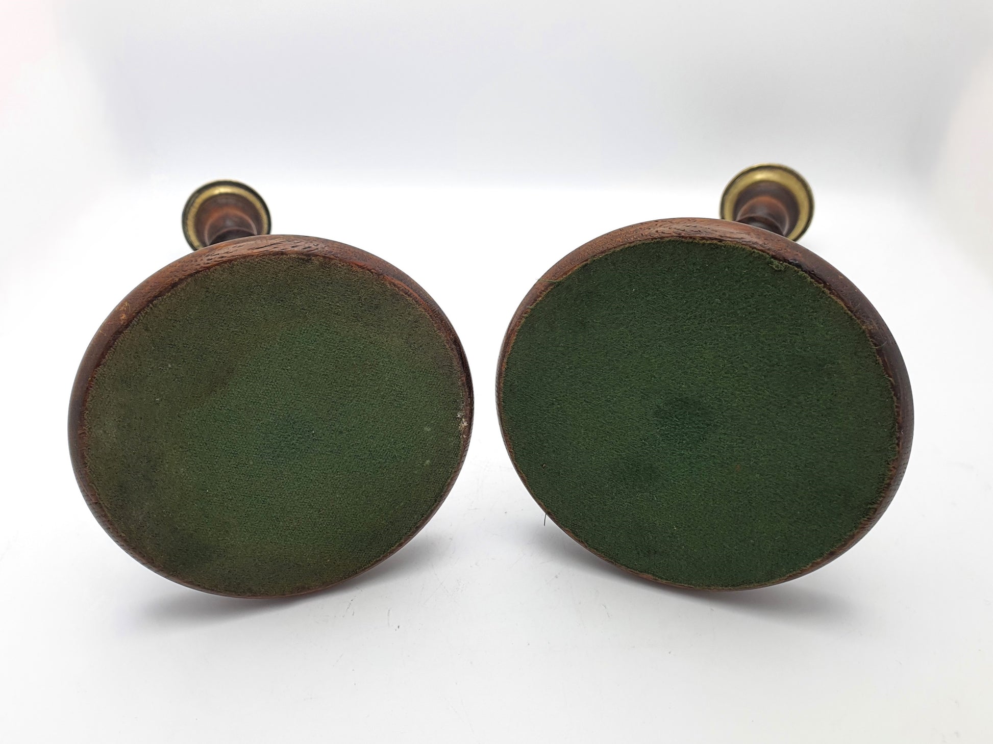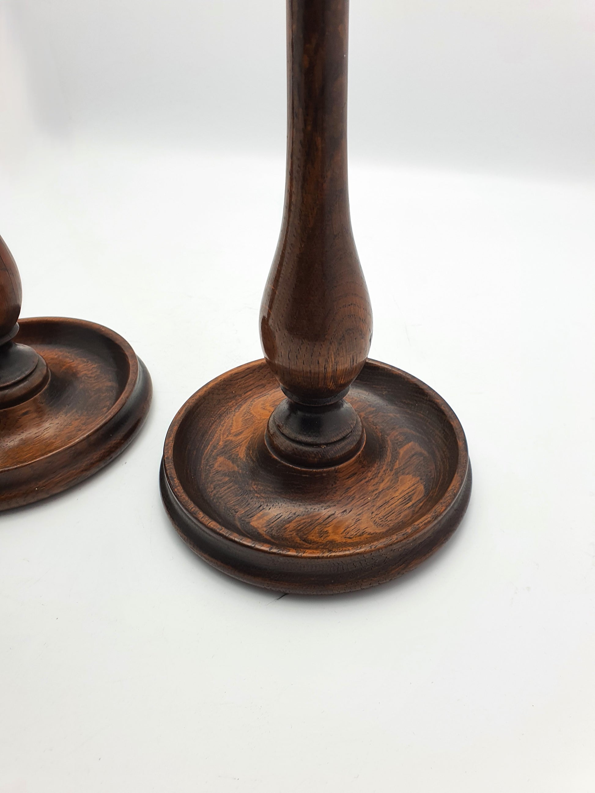 A Stylish Pair of Oak and Brass Candlesticks on turned circular bases - circa 1920.
