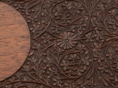 A superb Anglo-Indian carved hardwood jewellery box with three velvet lined compartments working lock and key and vacant circle cartouche to the top. Circa 1900. FREE worldwide delivery. Measurements: Height: 2 ½” (approx. 6.25cm) Length: 11” (approx. 27.5cm) Width: 6 ¾” (approx. 16.75cm) Weight: 994g In good condition