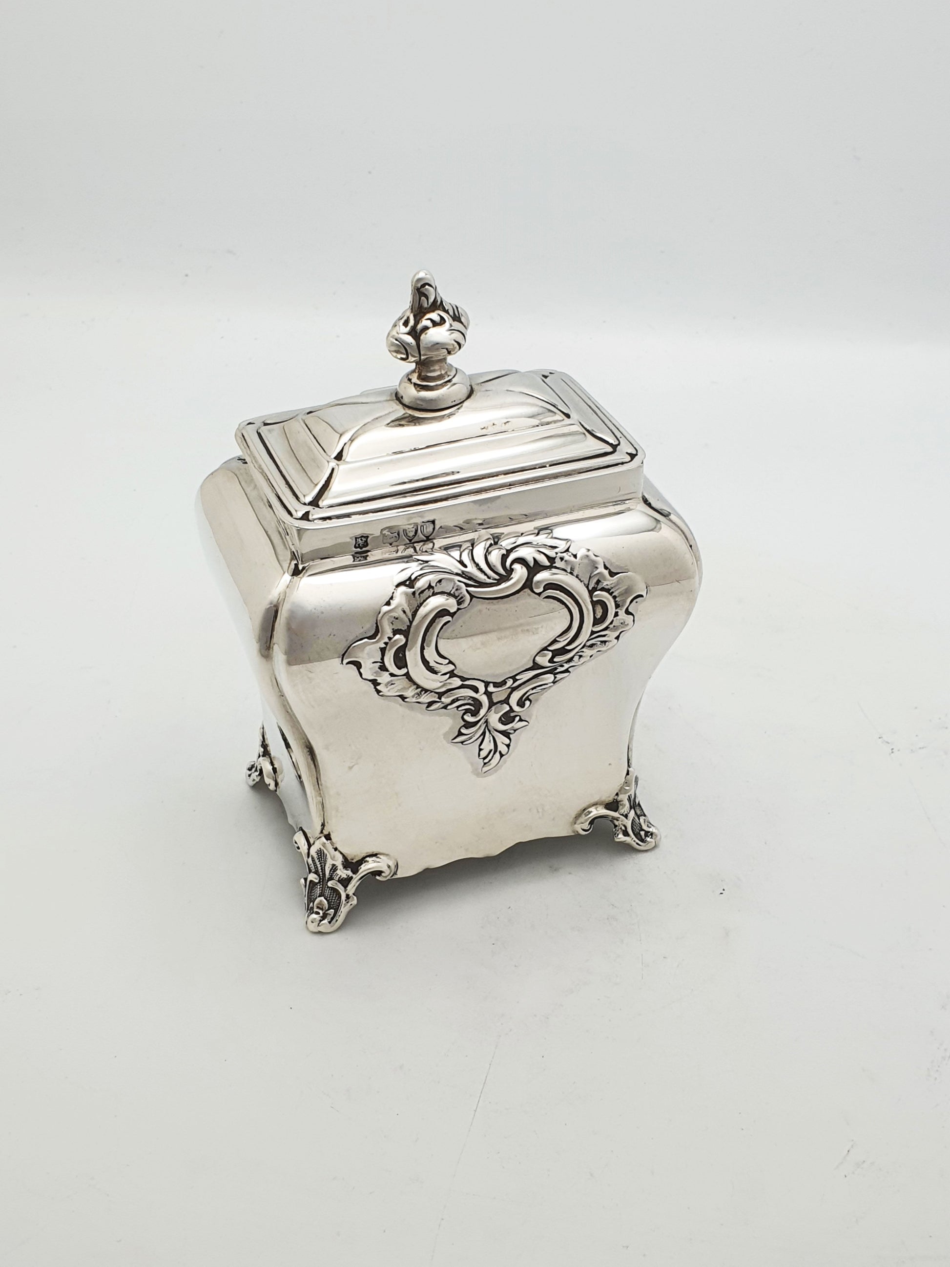 A Superb Antique Victorian Sterling Silver Tea Caddy of bold rococo-revival design. This magnificent piece embodies the opulence and flamboyance of the late 19th century, with a design that is both decorative and functionally refined.