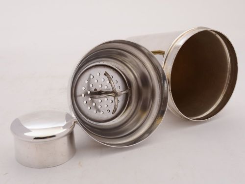 A superb English Art Deco silver plated cocktail shaker with pull off lid internal ice breaker and middle separates for easy filling. Comes with 1 1/2 oz silver plated measure. Circa 1930. FREE worldwide delivery Measurements: Height: 9” (approx. 22.5cm) Diameter across base: 4” (approx. 10cm) Total weight: 661g In good condition - any dark areas are shadows from the photography there is no damage to the silver plate.
