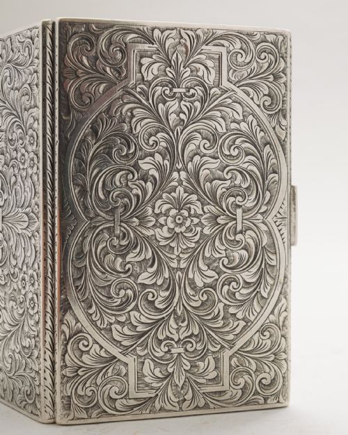 A Superb Italian 800 Silver Cigarette Case beautifully engraved back and front with push button side opener original gold interior and marked 800 Silver. - circa 1930 Free Worldwide & UK Delivery Measurements Height 1/2 ( approx 1.25 cm ) Length 5 1/4 ( approx 13.5 cm ) Width 3 1/4 ( approx 8 cm ) Weight 175 g In good condition - no dents or splits to the silver