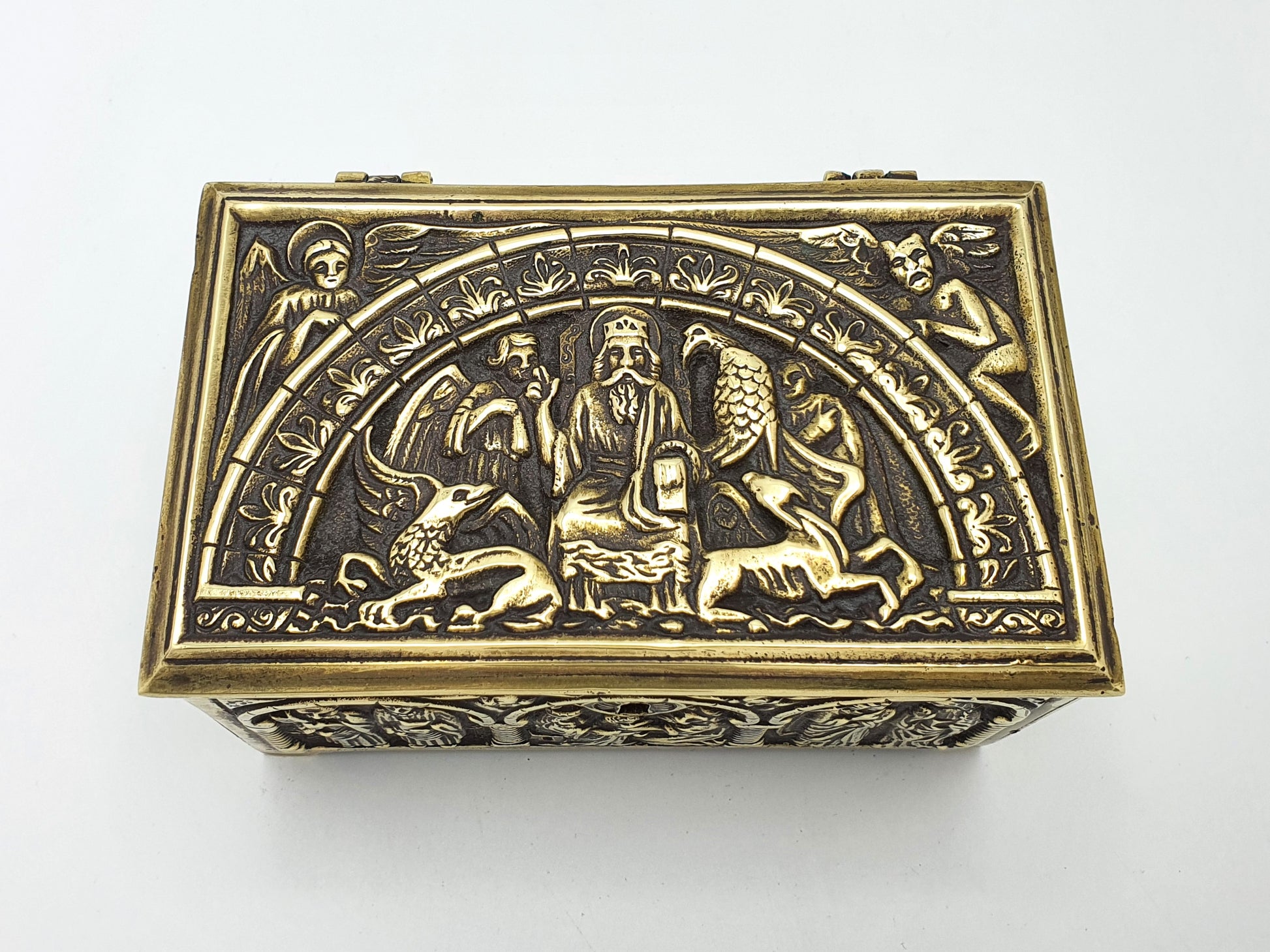An Unusual Antique Brass Jewellery Box with intriguing medieval embossed decorations original blue lining and hinged lid with working lock and key - circa 1920.