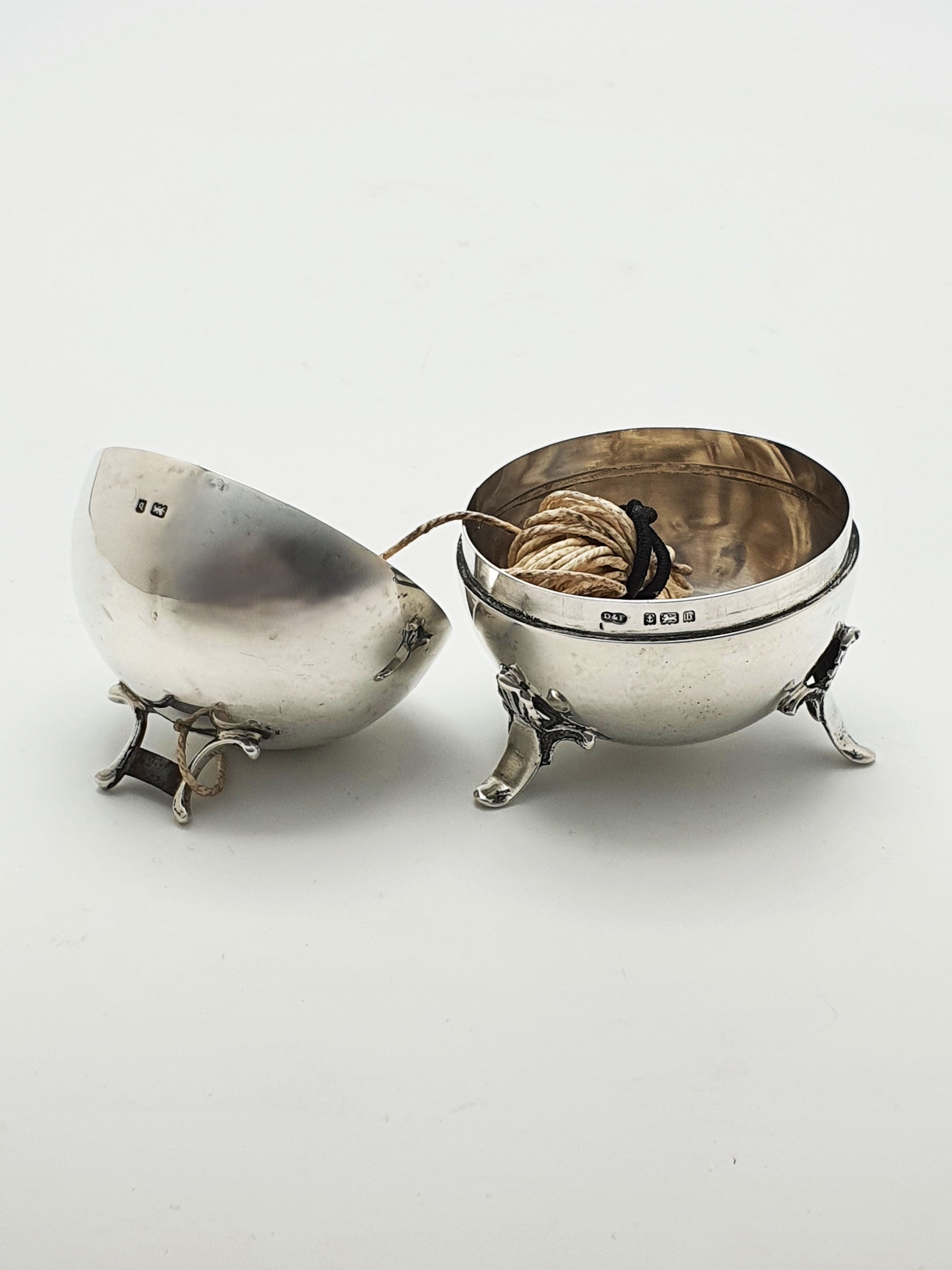A Really Unusual Antique Edwardian Sterling Silver String Holder crafted by the respected silversmiths Deakin & Francis in 1901. Designed in the form of a polished orb on elegant tripod legs, the string holder opens into two halves, with the string feeding neatly through a central guide hole.