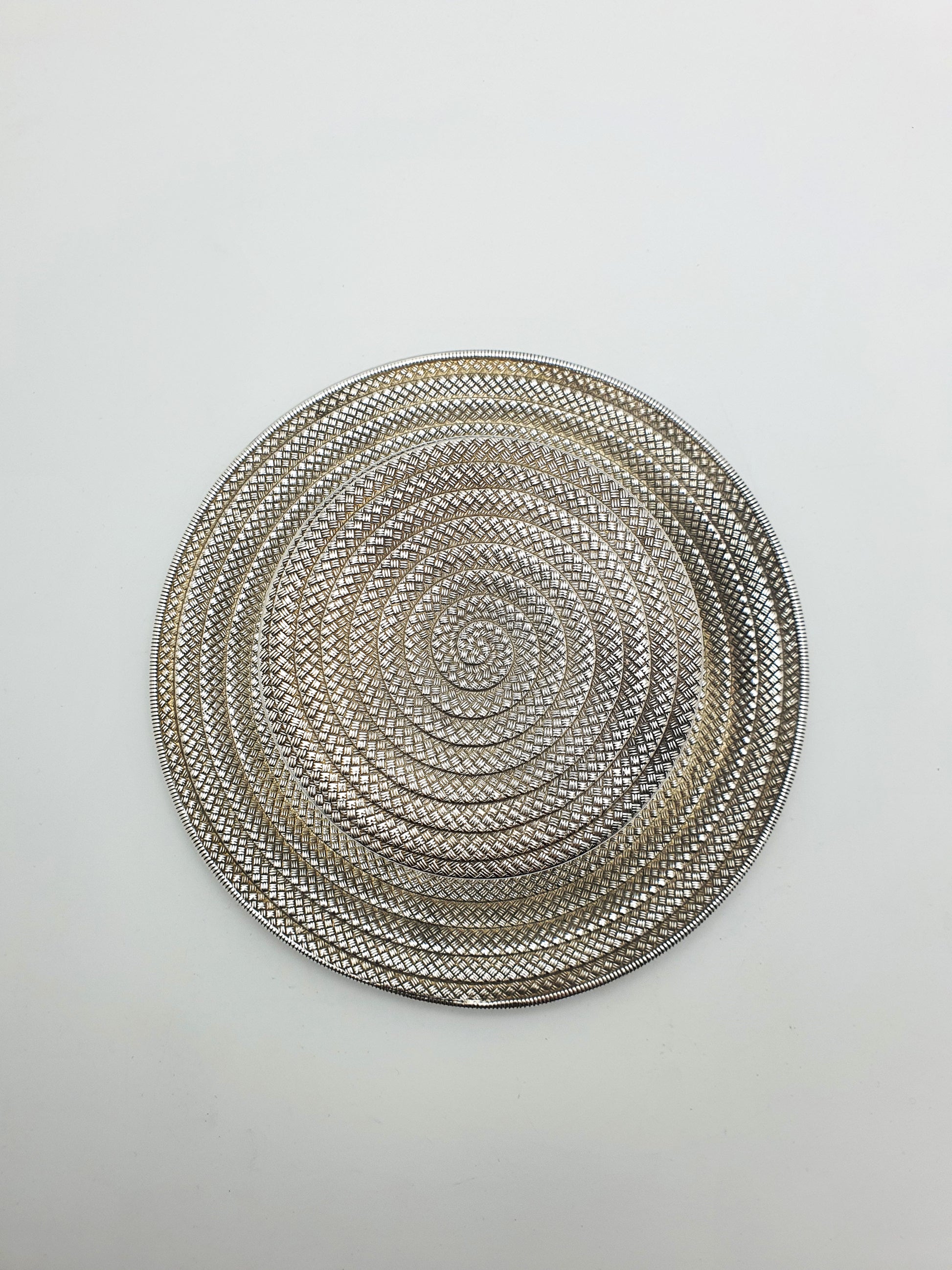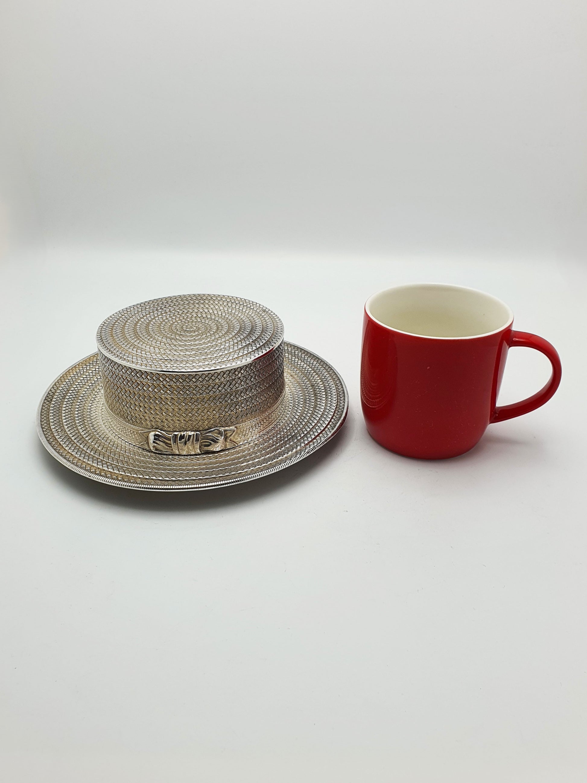 An Unusual Antique Novelty Silver-Plated Box crafted in the realistic form of a gentleman’s boater hat. The box features finely engine-turned decoration imitating the woven straw texture of a traditional boater, complete with a band and bow to the front. The hat lifts apart into two sections - the crown forming the lid, and the brim containing the hollow box interior, suitable for storing small items such as jewellery, trinkets, or desk accessories. The base of the box is stamped with the Diamond Registration Mark for 1881.