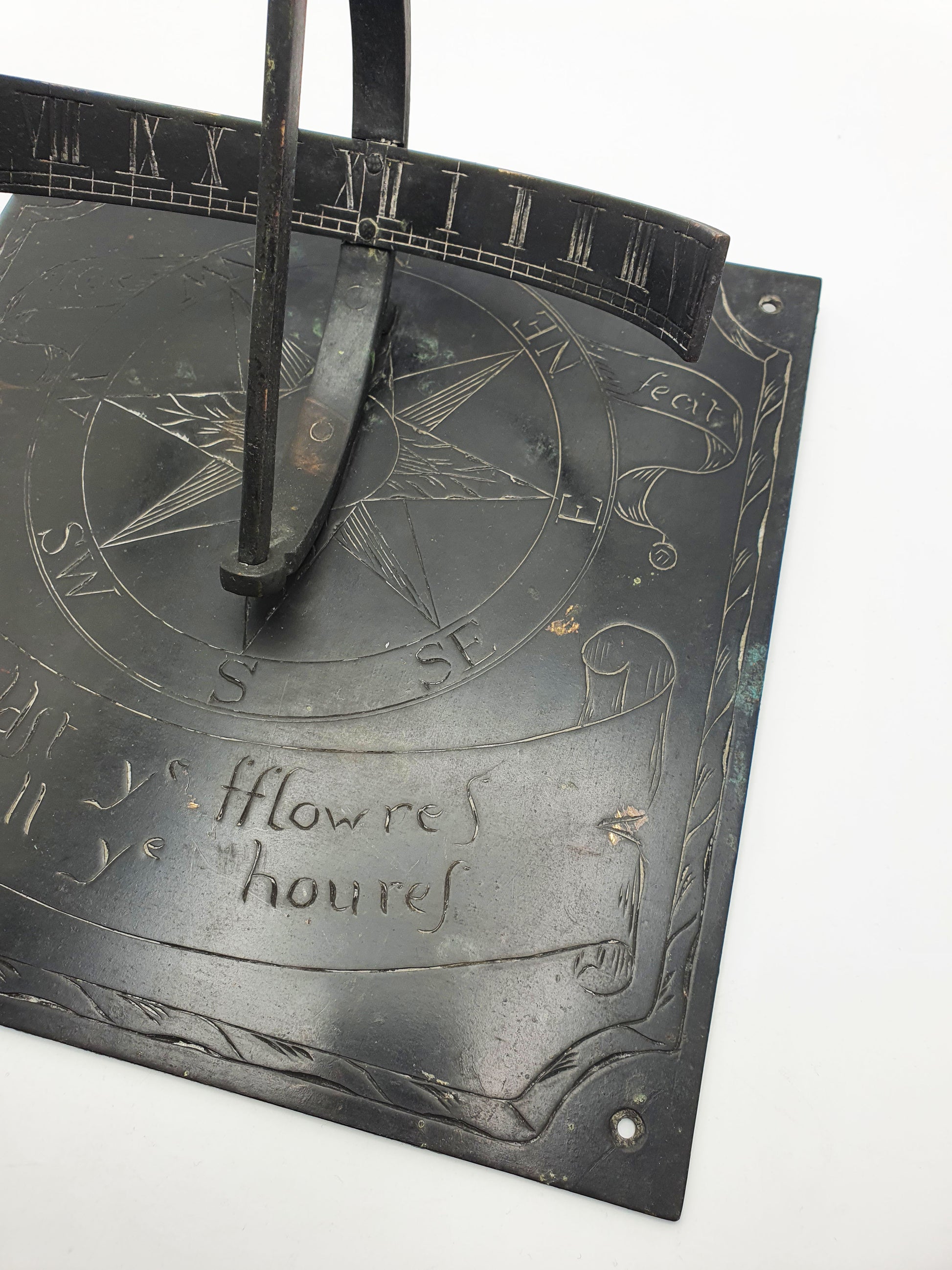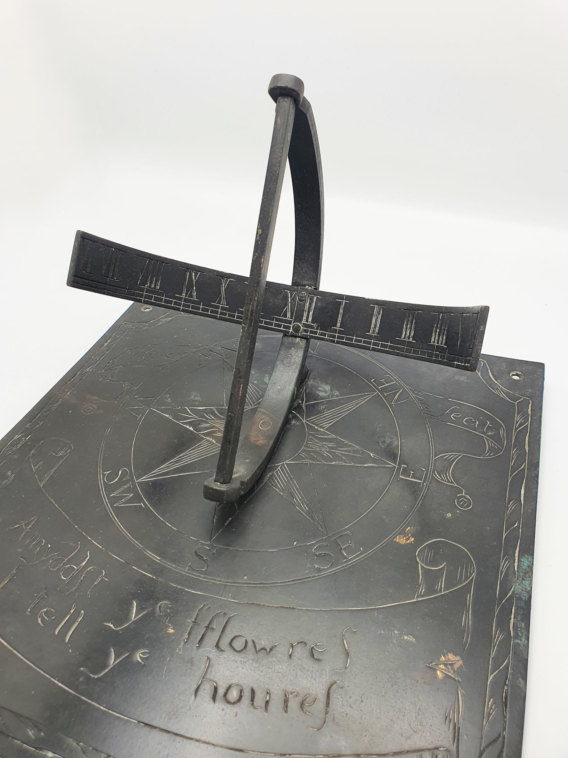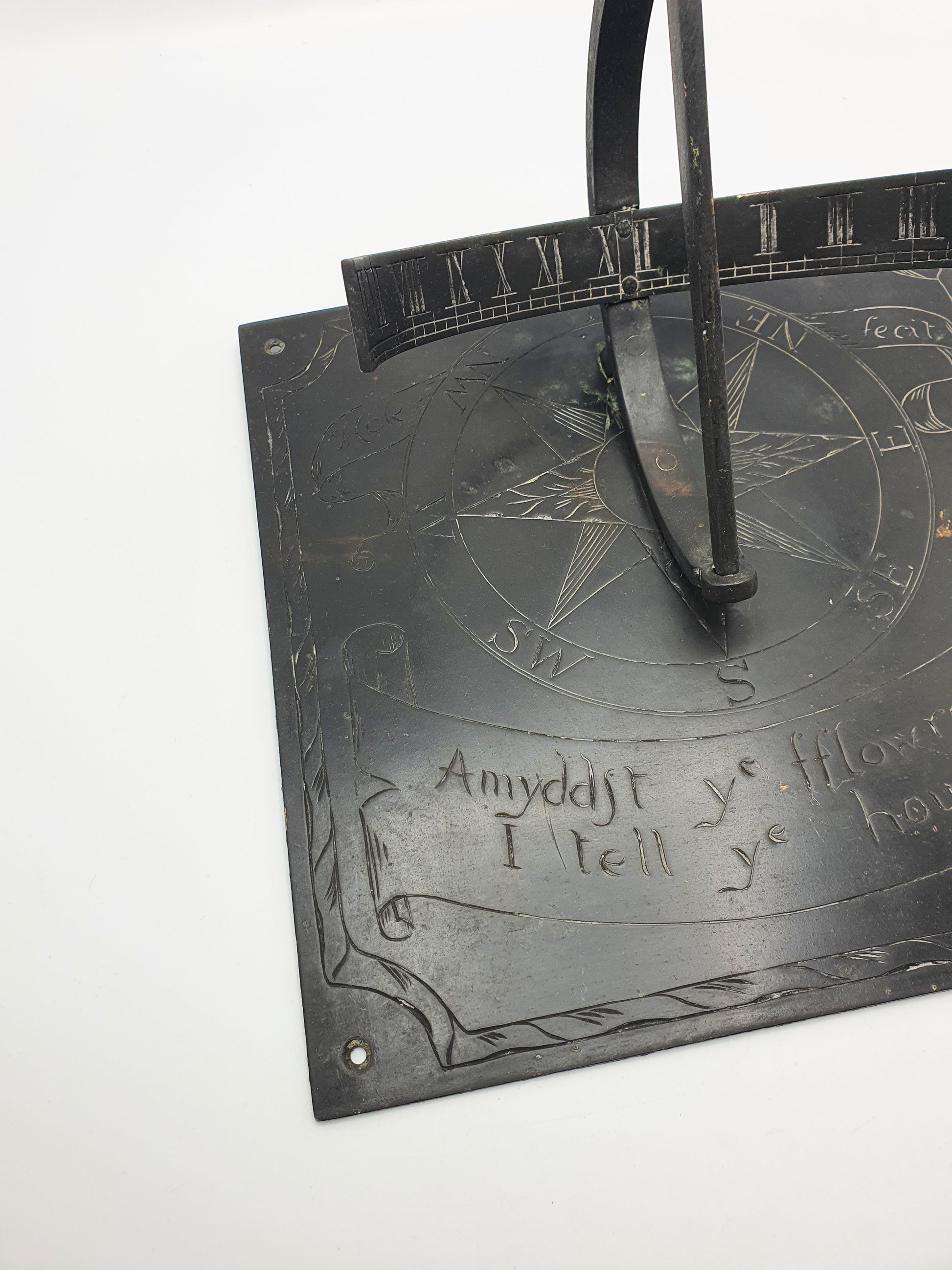 In good condition – Deeply aged finish and signs of natural wear consistent with age and outdoor exposure. All engraved elements remain legible, and the gnomon and time band are structurally sound and securely attached.