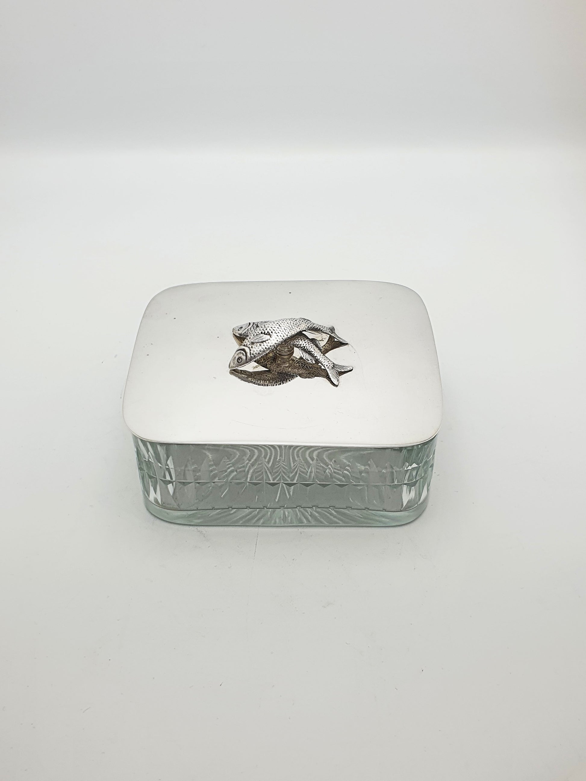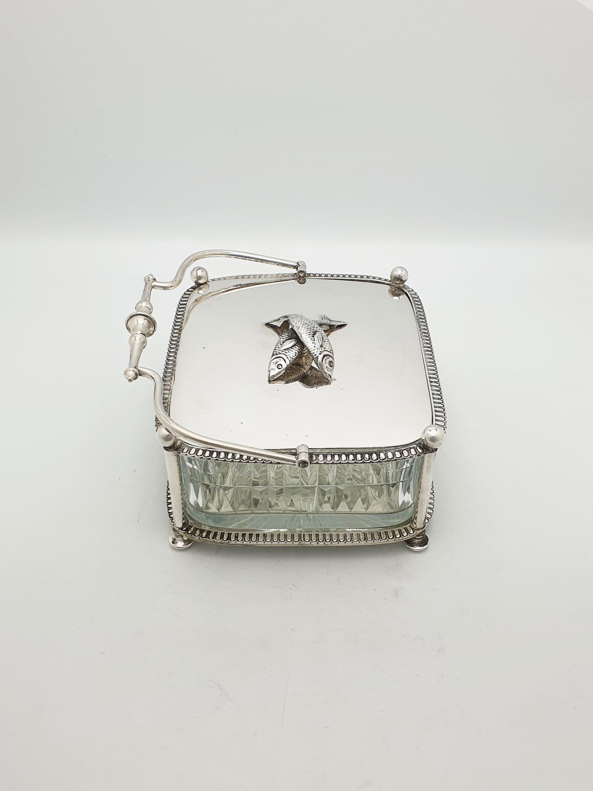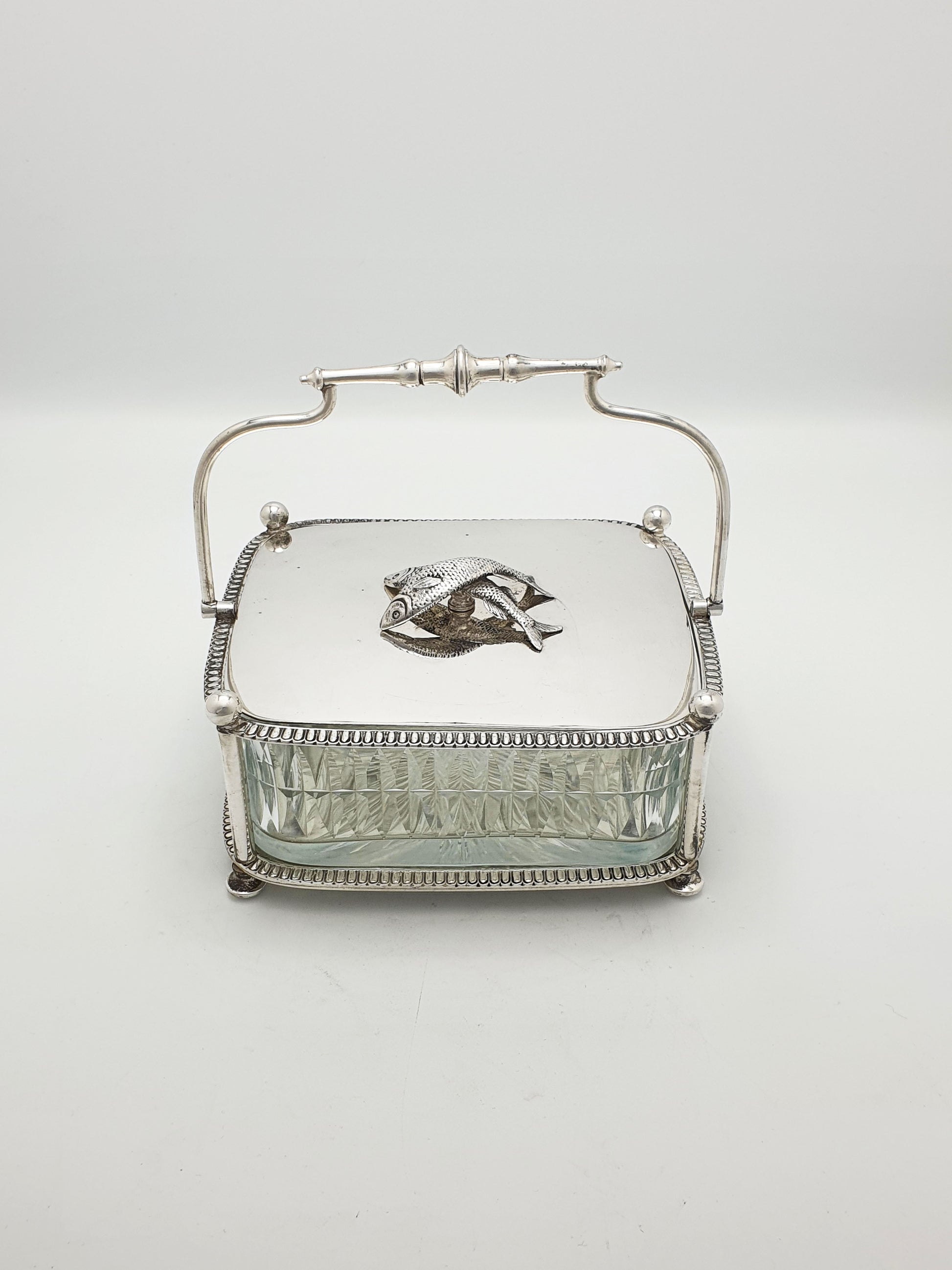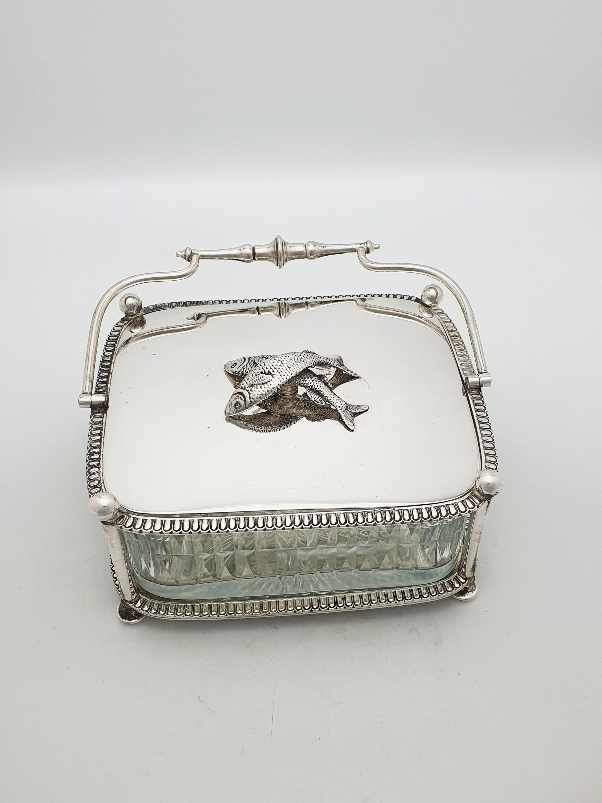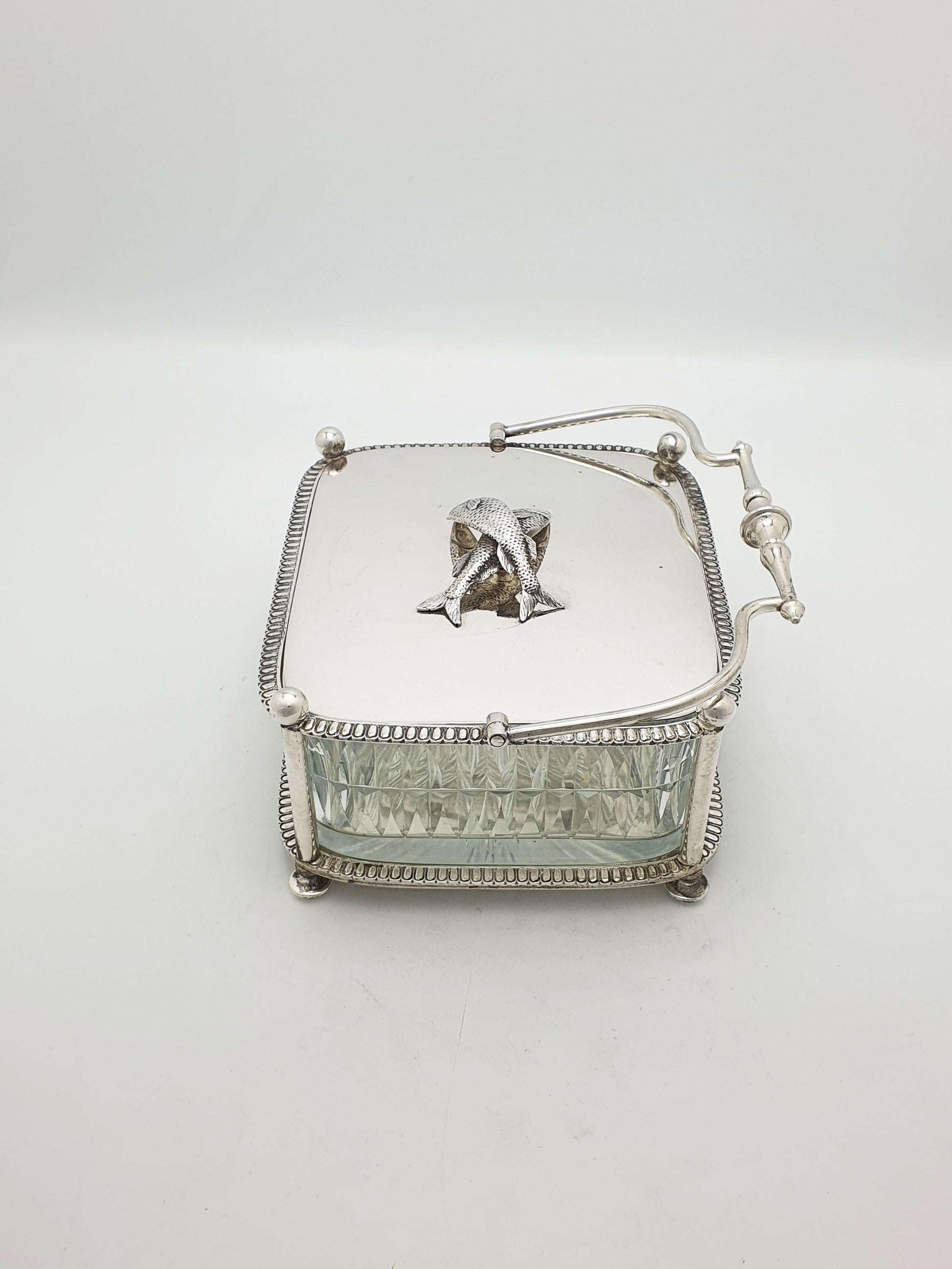An Unusual Antique Victorian Silver-Plated Sardine Dish designed with a swing handle, beaded edging, and a beautifully cut-glass liner, it is crowned with a whimsical finial of two finely modelled fish on the lid. Playful yet functional, this butter dish reflects the Victorian love of detailed ornamentation and their flair for turning everyday dining objects into artistic talking points – circa 1890.