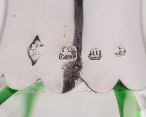 Lovely and unusual Arts & Crafts style green streaked decanter with silver neck and pouring spout. Hallmarked Birmingham 1911. It stands approx. 10 high and is in excellent condition.