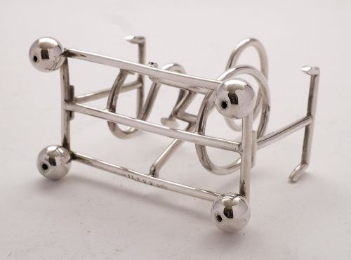 A Unusual Edwardian Silver Plated Toast Rack spelling the word TOAST with central ring carrying handle and stands on four ball feet - circa 1905 FREE UK & Worldwide Delivery Measurements Height 4 1/2 ( approx. 12 cm ) Length 4 1/2 ( approx. 12 cm ) Width 3 ( approx. 7.5 cm ) Weight 258g In good condition - any dark areas are from the photography