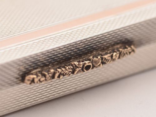 An unusual English gold and silver box with engine turned decoration gold outlined square to the top with original gilded interior and gold button to open. Hallmarked Birmingham 1966 and marked G & Co Ld for the renowned maker Garrard & Co of London. Made in the year that England won the gold cup. FREE worldwide delivery. Measurements: Height: ½” (approx. 1.25cm) Length: 3 ½” (approx. 8.75cm) Width: 3 ½” (approx. 8.75cm) Weight: 141g In good condition