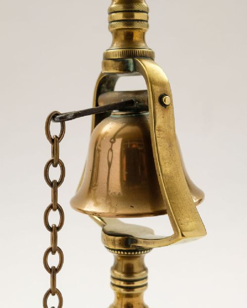 A Unusual Matched Pair Georgian Brass Tavern Candlesticks with tray bases and central bronze bell with pull chain to alert tavern staff to serve drinks. circa 1820 FREE UK & Worldwide Delivery Measurements Height 13 (approx. 33 cm ) Diameter of bases 5 1/2 (approx. 14 cm ) Total weight 1870 In good condition