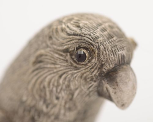 A Unusual Silver Plated Budgerigar realistically modelled with dark blue glass eyes - circa 1930 FREE UK & Worldwide Delivery Measurements Height to head 3 1/2 ( approx. 9 cm ) Length tail to beak 8 ( approx. 20 cm ) Width 1 1/2 ( approx. 3.75 cm ) Weight 275 g In good condition - any dark areas are from the photography