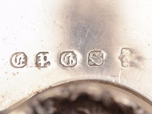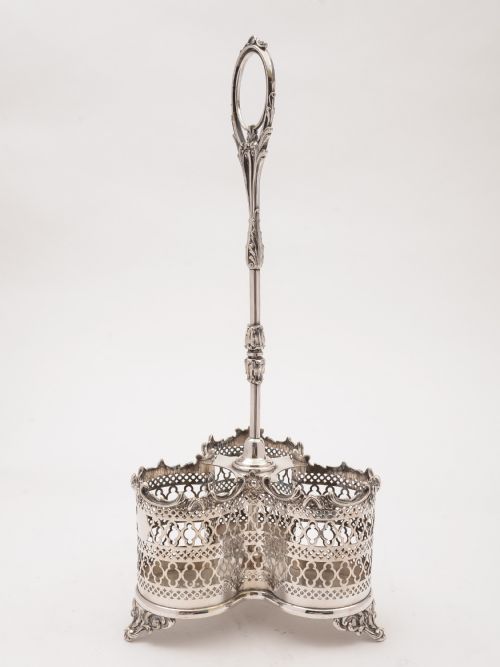 A fabulous English Victorian 3 bottle silver plated decanter stand with pierced decoration and central carrying handle which stands on 3 scroll feet. The glass bottles have overlay decoration one in blue one in green and one in cranberry and the bases are etched with grape and vine decoration with panel cut decoration to tops and stoppers. Circa 1880. FREE worldwide delivery Measurements: Stand height: 18 1/2 (approx 46.25cm) Length: 8 (approx 20cm) Width: 8 (approx 20cm) Bottle height: 14 (approx 35cm) Diameter across base: 2 3/4 (approx 6.75cm) Total weight: 3480g In good condition - no chips or cracks to glass