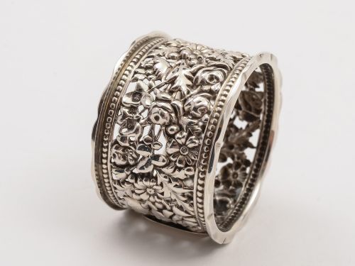 A lovely English Victorian pierced and embossed silver napkin ring with vacant cartouche presented in box which is red velvet and silk lined. Hallmarked Birmingham 1898. Measurements: Diameter: 1 3/4 (approx 4.5cm) Width: 1 1/4 (approx 3cm) Silver weight: 24g Very decorative napkin ring - would make a wonderful gift. In good condition