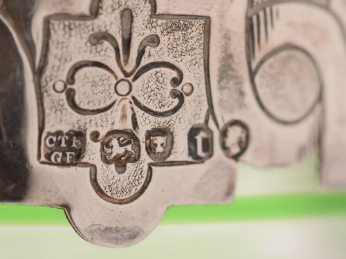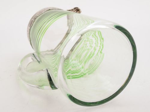 A fabulous English Victorian silver-topped and glass jug with green glass banded decoration to main body strap handle and ground pontil mark to base. The silver top has pouring spout and engraved decoration. Hallmarked London 1874 and marked CTF GF for the maker Charles Thomas Fox and George Fox. FREE worldwide delivery. Measurements: Height: 8 1/2 (approx 21.25cm) Length (to handle): 7 1/2 (approx 18.75cm) Width (top - to spout): 4 1/2 (approx 10.5cm) Diameter across base: 5 (approx 12.5cm) Weight: 1831g In good condition - any dark areas are shadows from the photography and there are no chips or cracks to glass.