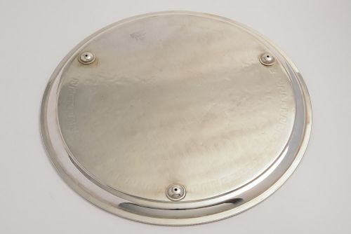 A Victorian silver plate large engraved salver/tray. Decorated with a foliage pattern and Greek key pattern to the border Sits on three bun feet. Made by the renowned maker Mapping & Webb London. Circa 1890 Worldwide first class tracked and signed for delivery is included in the price. Measurements: Diameter: 16 (approx 40cm) In good condition - any dark areas are shadows from the photography there is no damage to the silver plate.