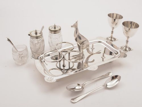 A fabulous English Victorian novelty breakfast cruet for two comprising of X2 silver plated egg cups and spoons mustard salt & pepper pots and silver plated kangaroo as central carrying handle. Sits on silver plated tray which has ball feet. Circa 1890 and marked F.W S for maker Wilson & Co Sheffield. Worldwide first class tracked and signed for delivery is included in the price. Measurements: Total height: 4 (approx 10cm) Length: 8 1/2 (approx 22cm) Width: 4 1/2 (approx 11.75cm) Total weight: 954g In good condition - any dark areas are shadows from the photography there is no damage to the silver plate and there are no chips or cracks to the glass.