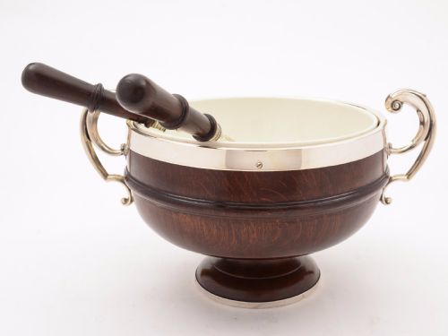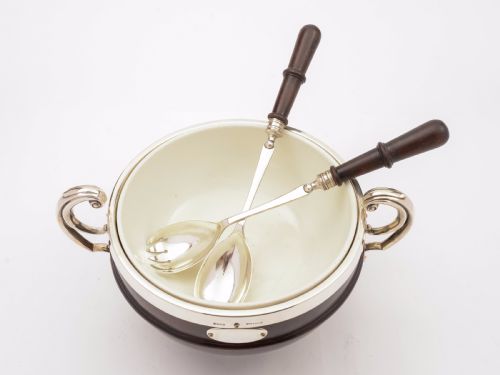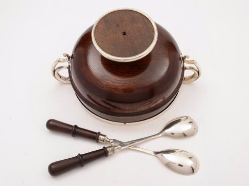 A fabulous English Victorian oak and silver plated salad bowl with trophy style handles and sits on pedestal base. Has white china liner and matching salad servers and vacant cartouche to front. Circa 1890. FREE worldwide delivery. Measurements: Height: 6 (approx 12cm) Length (to handles): 12 1/2 (approx 31.25cm) Diameter across top: 9 (approx 22.5cm) Salad server length: 12 (approx 30cm) Total weight: 2100g In good condition - any dark areas are shadows from the photography there is no damage to the silver plate and no chips or cracks to china liner.