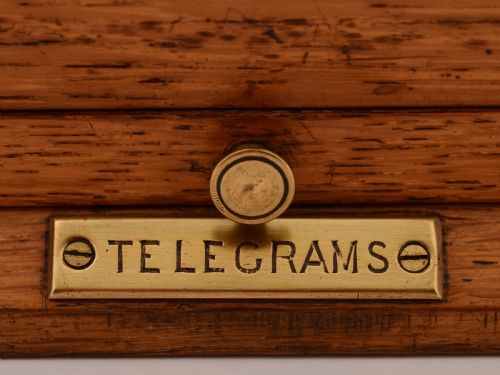 A fabulous English Victorian oak country house letter box with beveled glass windows a tray at the bottom for telegrams and brass mounts with letters to top and slot for posting. Has working lock and key to bottom tray for collecting mail and slots to either side for paper and envelopes. These were often found in large hotels and country houses etc. Outgoing mail would be collected from the box and taken to the local post office. Circa 1890. FREE worldwide delivery. Measurements: Height: 10 1/2 (approx 26.25cm) Length: 17 (approx 42.5cm) Width: 8 1/2 (approx 21.25cm) Total weight: 4760g In good condition