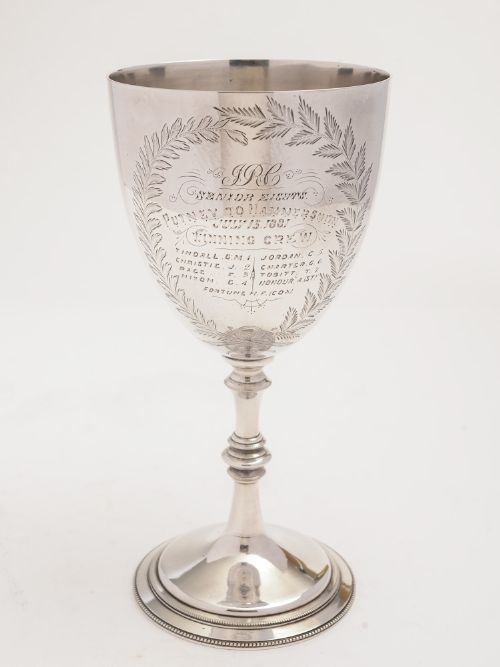 An English Victorian silver plated trophy cup celebrating the 1881 Putney to Hammersmith Senior Eights boat race. Beautifully engraved with the two teams in their boats on the river on one side and Senior Eights Putney to Hammersmith July 15th 1881 Winning Crew on the other side with team member names listed. Please note: The darker areas on the cup are a reflection from the photography and the plating is in good condition. Measurements: Height: 8 (approx 20cm) Diameter across top: 4 (approx 10cm) Total weight: 349g The depiction of the two teams is unusual and not often found on trophy cups making this an interesting collectors piece and great gift for rowing enthusiasts! In good condition
