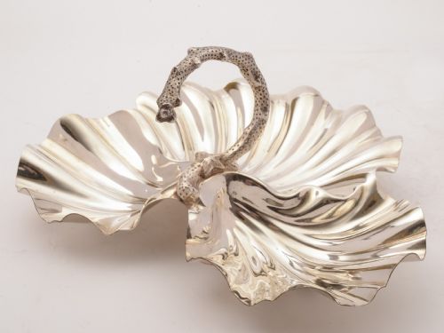 A wonderful English Victorian silver plated shell-shaped serving dish which sits on 3 shell feet and has coral-style handle. Circa 1890 and made by Creswick & Co. FREE worldwide delivery. Measurements: Height: 4 (approx 10cm) Length: 11 (approx 27.5cm) Width: 10 (approx 25cm) Weight: 719g In good condition - any dark areas are shadows from the photography there is no damage to the silver plate.