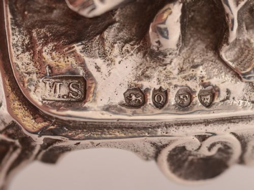 A lovely English Victorian cast silver cherub ornament on rectangular base with 4 scroll feet. Hallmarked London 1891 and marked M.S for the maker Moses or Morris Salkind Mulberry Street London. FREE worldwide delivery. Measurements: Height: 3 (approx 7.5cm) Length: 3 (approx 7.5cm) Width: 2 (approx 5cm) Weight: 125g (approx 4 troy ounces) In good condition - any dark areas are shadows from the photography.
