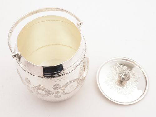 A lovely English Victorian silver plated biscuit barrel with beaded and engraved decoration and fold-down handle with pull-off lid and family crest of roaring lion. Circa 1880. Marked R&B for the maker Samuel Roberts & Charles Belk Furnival Works. FREE worldwide delivery. Measurements: Height: 6 1/2 (approx 16.25cm) Diameter (top and bottom): 4 (approx 10cm) Weight: 598g In good condition - any dark areas are shadows from the photography there is no damage to the silver plate.