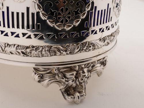 A stunning English Victorian silver plated champagne bucket with wonderful pierced and embossed swag decoration to to the body and embossed fruit and vine decoration to the top stands on 3 cast scroll feet with cobalt blue glass liner. Circa 1890. Worldwide first class tracked and signed for delivery is included in the price. Measurements: Height: 7 (approx 18cm) Diameter of top: (12 (approx 30cm) In good condition - any dark areas are shadows from the photography - there is no damage to the silver plate.