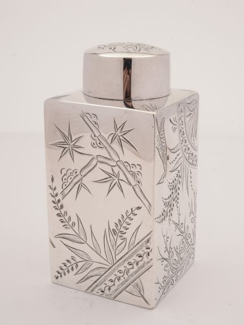 A nice English Victorian silver plated tea caddy with engraved flower and butterfly decoration in the Victorian Aesthetic style. Has pull-off lid circa 1890. FREE worldwide delivery. Measurements: Height: 5 (approx 12.5cm) Base: 2 1/2 square (approx 6.25cm) Weight: 331g In good condition - any dark areas are shadows from the photography there is no damage to the silver plate.
