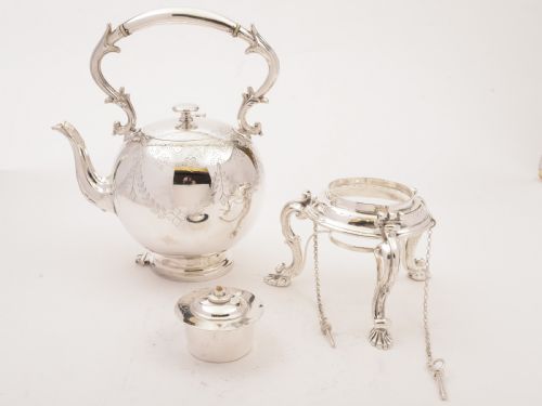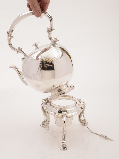 A wonderful English Victorian silver plated round tea kettle with engraved and embossed decoration which sits on stand with burner on three padded feet. You can remove the back pin on the stand so that you can tip the kettle forwards to pour water and can remove the front pin as well to allow you to remove kettle from stand. Circa 1890. Worldwide first class tracked and signed for delivery is included in the price. Measurements: Height (including stand): 14 (approx 35cm) Length (to spout): 10 (approx 25cm) Width: 6 (approx 15cm) Total weight: 1670g In good condition - any dark areas are shadows from the photography there is now ear to silver plate.