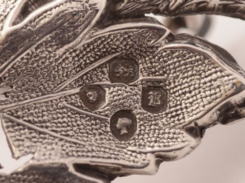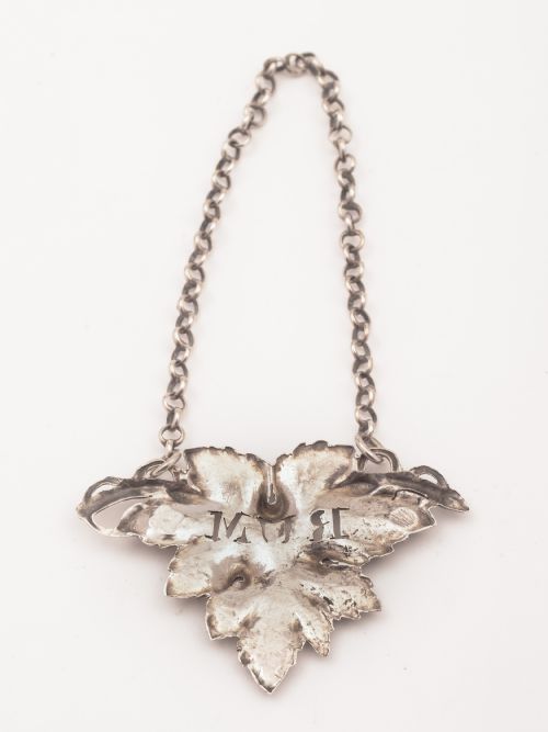 A good English Victorian silver rum decanter label in the shape of an embossed vine leaf with word RUM stamped onto it and chain. Hallmarked London 1837 - first year of Queen Victorias reign and marked G A for the maker George Angell. FREE worldwide delivery. Measurements: Length (including chain): 4 1/2 (approx 11.25cm) Width of label: 2 1/2 (approx 6.25cm) Weight: 12g In good condition - any dark areas are shadows from the photography.