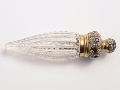 Lovely Victorian American silver gilt topped scent bottle inset with large Amethyst in top & five smaller Amethyst around the top edge. Own original stopper has zipper cut decoration on tapered body. Also has a ring attached which means it may have attached to a chatelaine. Marked sterling silver. Worldwide first class tracked and signed for delivery is included in the price. Measurements: Length: 4 1/4 (approx 10.5cm) Width: 1 1/4 (approx 3.25cm) Total weight is 54g In good condition