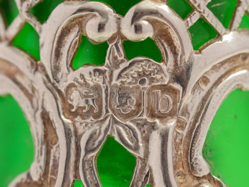 An unusual small Victorian silver-topped liqueur decanter which is green at the top and fades to clear towards the bottom. Hallmarked London 1897. Measurements: Height: 8 Diameter at base: 3 In good condition.
