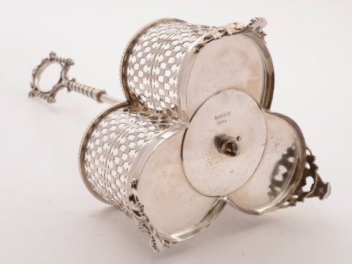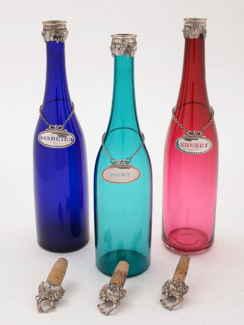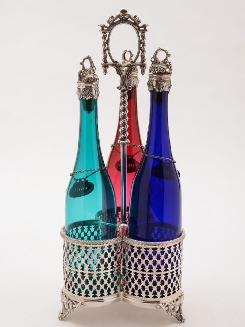 A fabulous English Victorian silver plated three bottle decanter stand with lovely pierced decoration and stands on three scroll feet with central carrying handle. Comes with three coloured decanters with silver plated cork-lined tops and silver plated decanter labels for Madeira Sherry & Port. Circa 1870. FREE worldwide delivery. Measurements: Height (stand): 17 (approx 42.5cm) Length (stand): 6 (approx 15cm) Width (stand): 6 (approx 15cm) Bottle height: 13 1/2 (approx 33.75cm) Bottle diameter (base): 3 (approx 7.5cm) Total weight: 3130g In good condition - any dark areas are shadows from the photography there is no damage to the silver plate and no chips or cracks to glass.