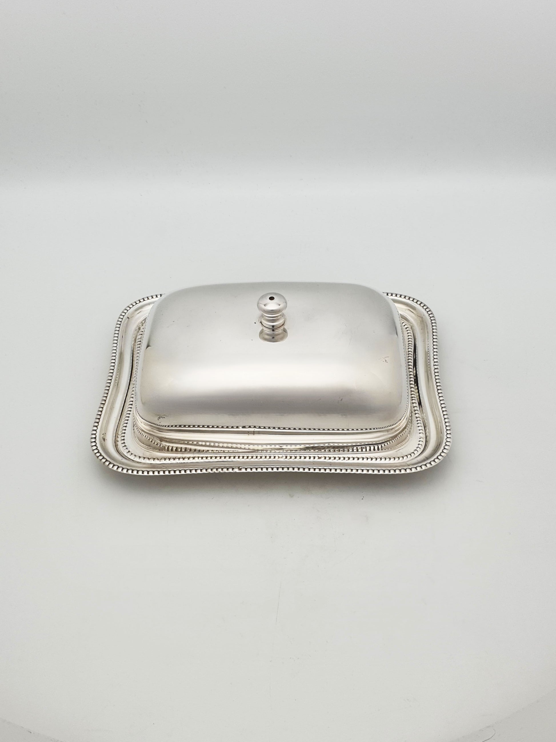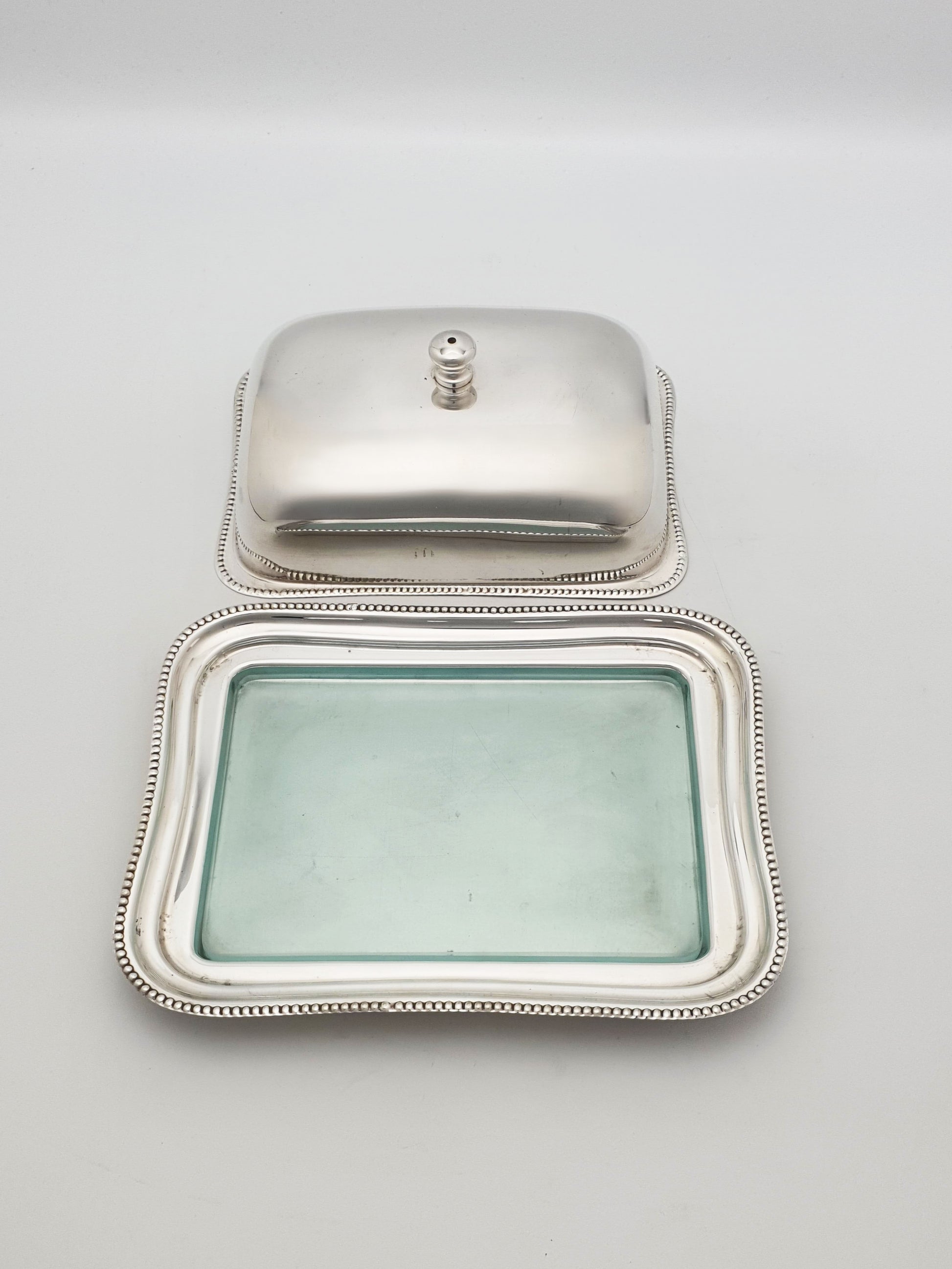 A Nice Vintage Silver-Plated Covered Butter Dish featuring a detachable lid and original glass liner. The domed lid is smooth and highly polished, topped with a turned silver-plated finial for easy lifting. The clear, fitted glass liner is removable for easy cleaning and designed to keep the metal free from direct contact with the butter – circa 1960.