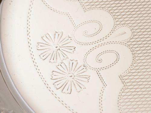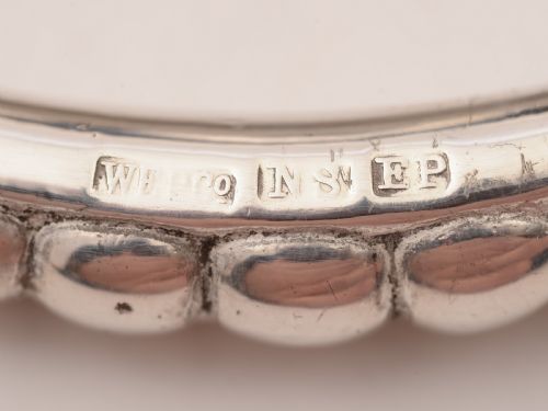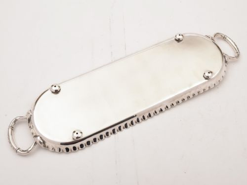 A lovely German WMF silver plated serving tray with engraved decoration and vacant central cartouche to the main body. It has fluted sides and carrying handles to either end. Stands on 4 ball feet and is marked WMF circa 1900. FREE worldwide delivery. Measurements: Height: 1 (approx 2.5cm) Length: 19 3/4 (approx 49.5cm) Width: 5 1/2 (approx 13.75cm) Weight: 880g In good condition - any dark areas are shadows from the photography there is no damage to the silver plate