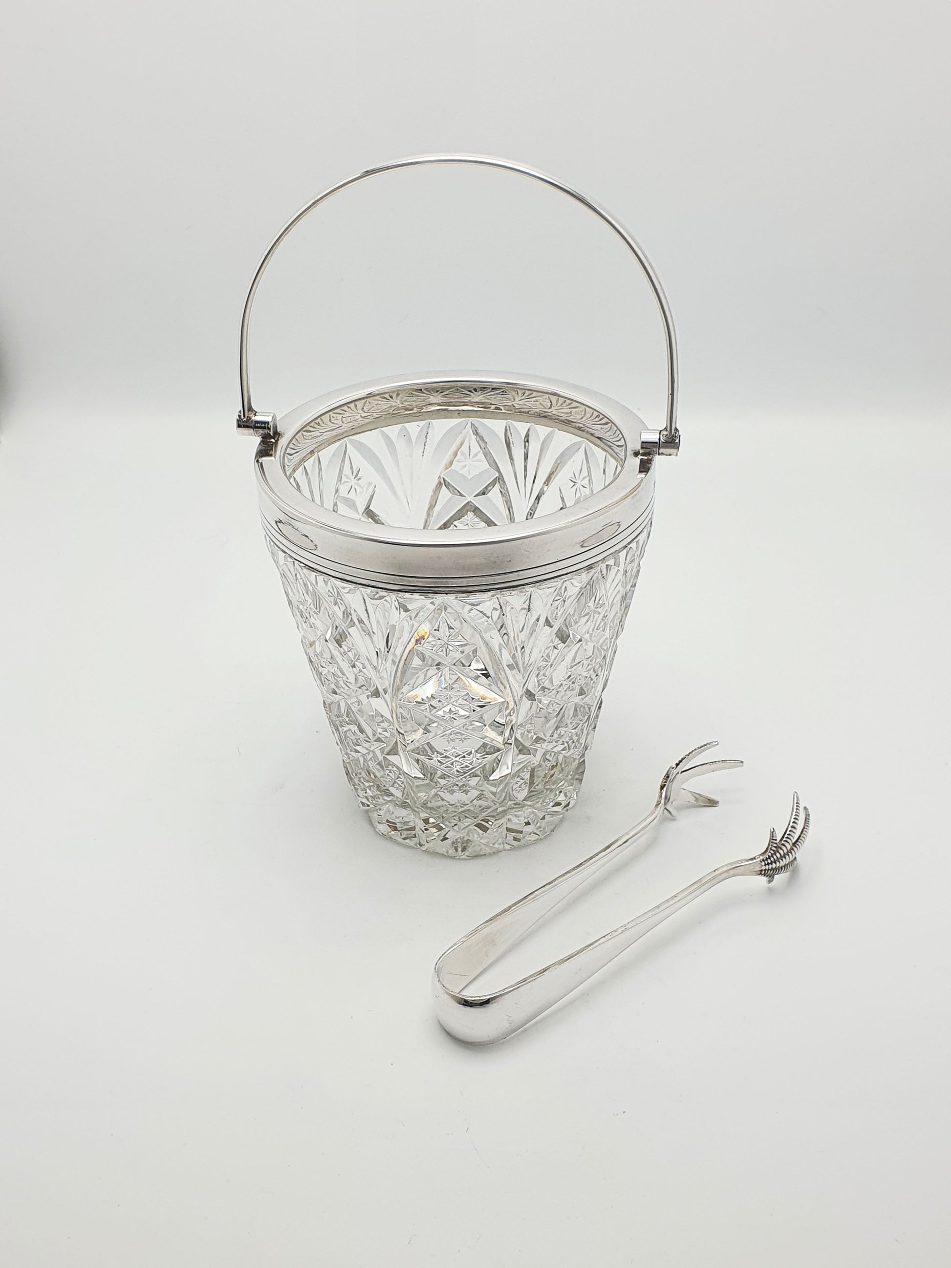 A Wonderful Ice Bucket featuring a brilliant cut glass body with classic starburst and floral patterns catching the light beautifully, and a silver-plated mount with a matching swing handle. This ice bucket is paired with a lovely set of silver-plated talon tongs – circa 1930.